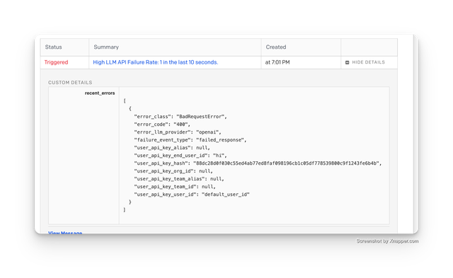 - High LLM API Failure Rate. Configure X fails in Y seconds to trigger an alert.